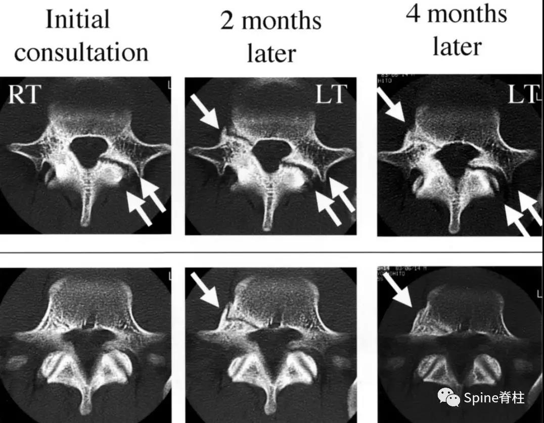 图:起始CT提示L5左侧峡部裂(双箭头),起始CT检查后2个月复查可见出现右侧椎弓根裂(单箭头),4个月复查可见椎弓根裂愈合(单箭头)