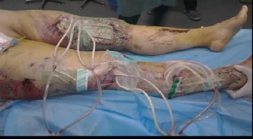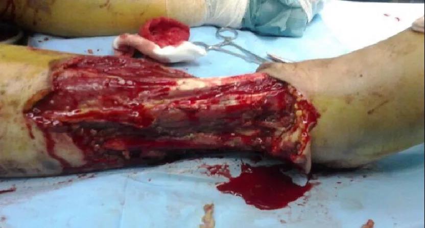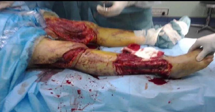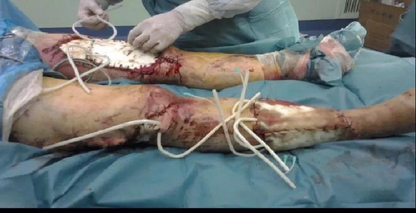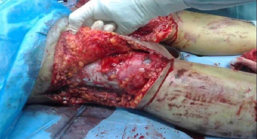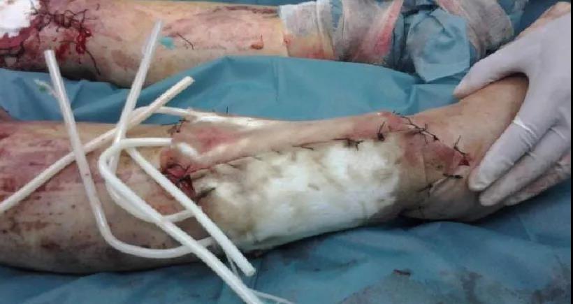 男性患者,40岁。车祸致双下肢流血伴皮肤缺损2小时入院。