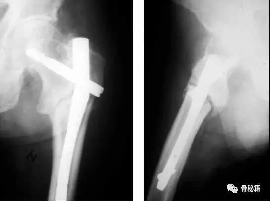 骨折复位不良、断端无接触、没有动力化、粗隆下骨折应力较大。骨折延迟愈合,6个月的时候发生了断钉