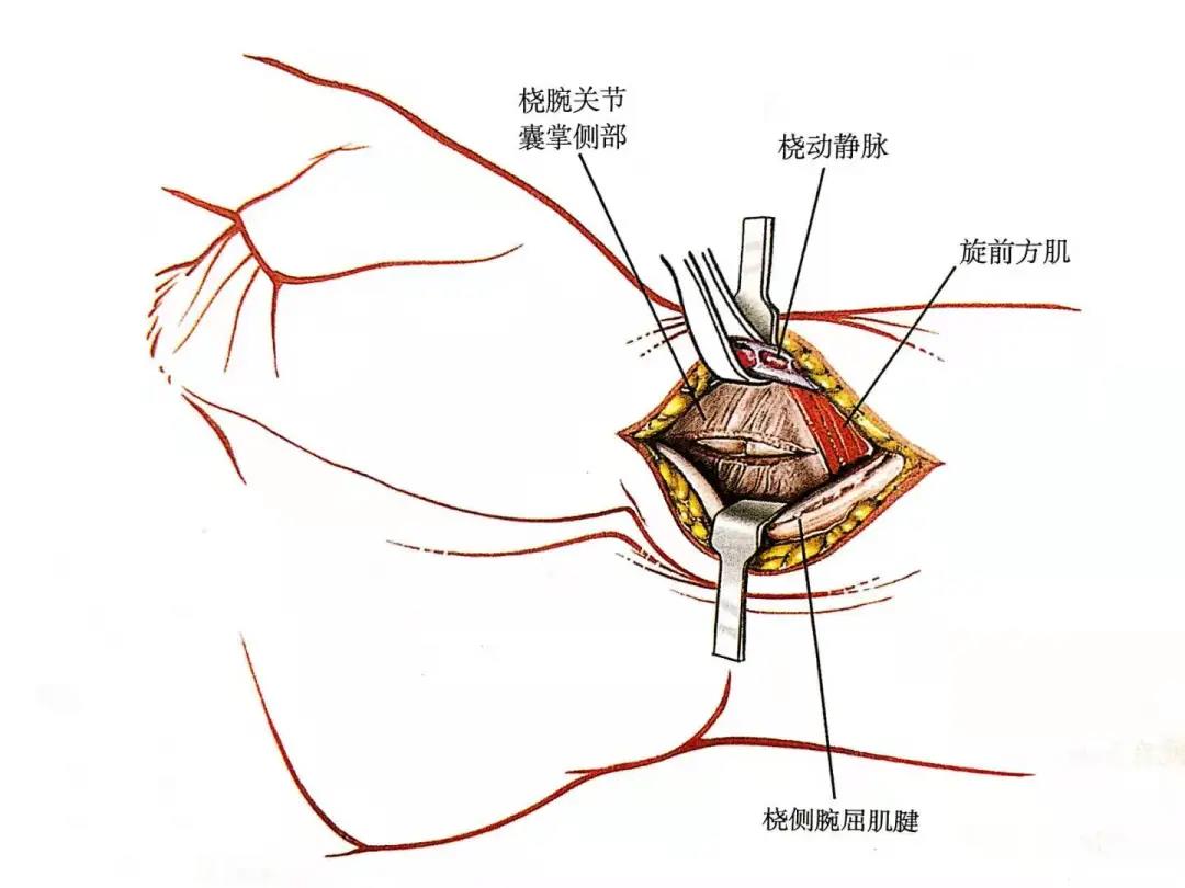 - 找到桡侧腕屈肌腱并向远端分离,切开其表面的屈肌支持带,将桡侧腕屈肌腱从屈肌支持带的管中游离出来并将其牵向内侧,腕关节桡侧掌面即可显露。