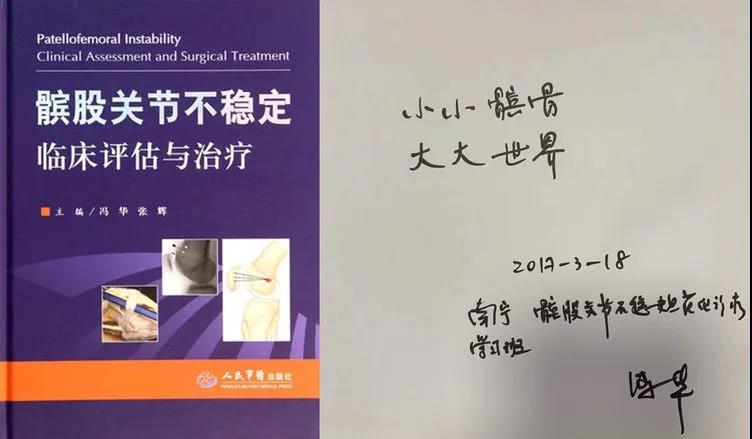 尽管不等同,但很多情况下髌骨脱位也叫髌股关节不稳定,“小小髌骨、大大世界”是2017年3月我举办“髌股关节不稳定规范化诊疗学习班”会场上冯华老师赠送他主编的《髌股关节不稳定临床评估与治疗》给我时随手在书上为我题的几个字,每看到髌骨脱位的病人我就想起他、想到这几个字,这几个字包含的东西实在太多,也凝固了冯华老师生前太多的心血,他不断的在国内推出新的E技术、新的理念,在他的大力推动下,我国髌股关节不稳定的诊疗逐渐走向规范化!