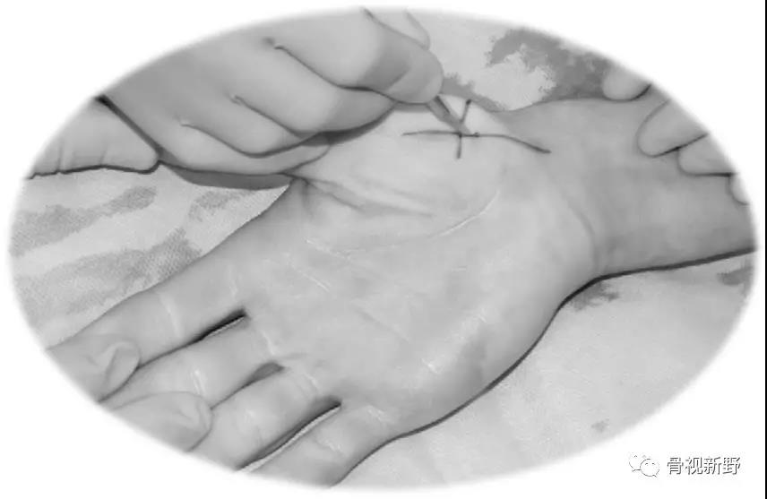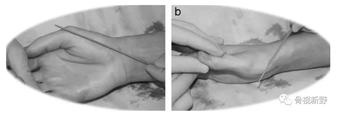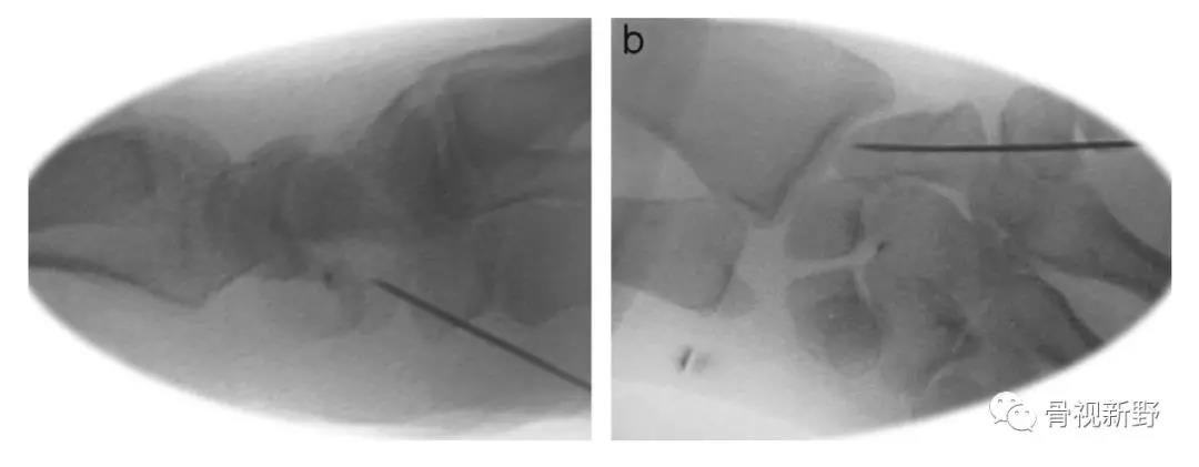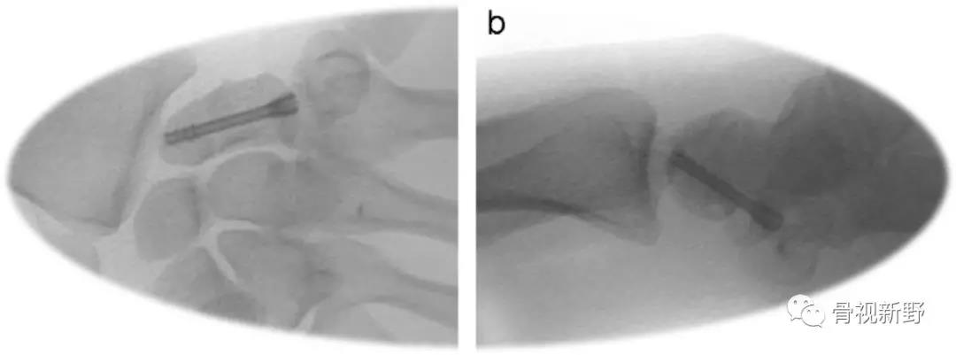 透视下进针,导针经过大多角骨及舟状骨远、近端皮质下2-4mm。再打入第2枚平行针,仅穿过大多角骨。分别测深,螺钉长度为第1枚针(舟状骨+大多角骨的长度)减第二枚针(大多角骨的长度)的深度(舟状骨长度)。