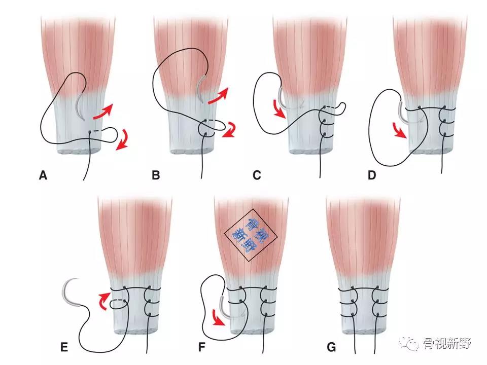 Krackow 缝合 (即锁边缝合) 及其改良术式详见”骨视新野“ 2018-12-6日图文“髌韧带撕脱的Krackow及其改良缝合方法”