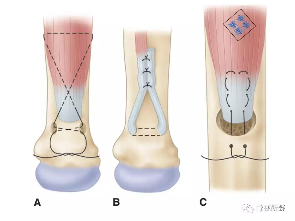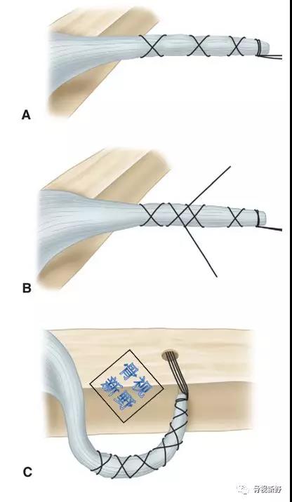 A. 在肌腱末端缝一针缝线,并借此缝线将肌腹牵向远端拉直,确定肌腱的固定点.在此点稍远侧的骨上横行钻孔,肌腱两侧的缝线交叉穿过骨孔,在骨干表面打结。