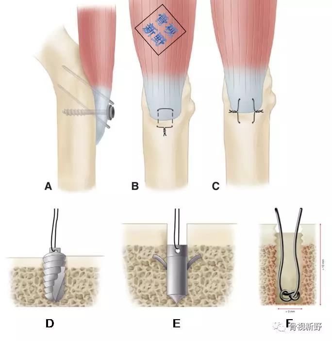 骨膜必须切开、剥离以暴露足够的骨表面,便于去除表面皮质。在肌腱固定之后,要争取在肌腱表面覆盖缝合骨膜,将骨膜缝合固定于肌腱边缘。