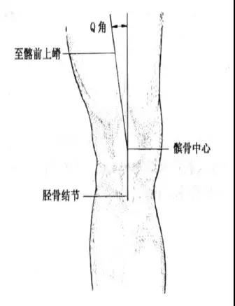 - Q角:指髂前上嵴到髌骨中心点连线同胫骨结节与髌骨中心点连线所构的夹角。