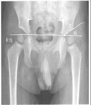 - 髋臼指数(actebular index,AI,亦称髋臼角):髂骨最下缘与髋臼最外缘的连线与H线的夹角(H线,即Hilgenreiner线,组成两侧髋臼髂骨最下缘的连线),适合于“Y”型软骨尚未闭合的儿童(≤10岁)髋臼的测量。