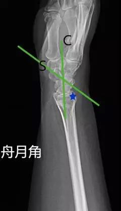 - 舟月角:在腕关节侧位片舟骨与月骨(近端与远端)中轴线的夹角。
