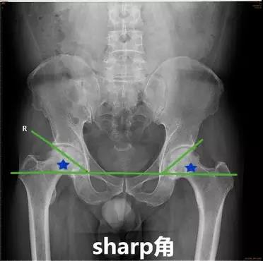 - Sharp角:即双侧泪滴下端连线与泪滴下端至髋臼上缘连线所成的角。