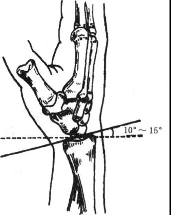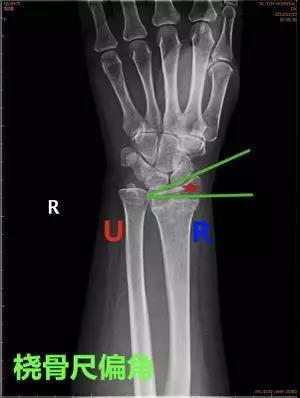 - 桡骨尺偏角:在桡骨、尺骨的下尺桡关节面作一水平线,此线与桡骨远端关节面的切线所形成的夹角。