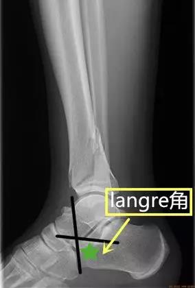 - langre角:在踝关节侧位片或者跟骨侧位片沿跟骨后、中距关节面作一连线,并作跟骨与跟骰关节面连线,此两线相交所形成的角。