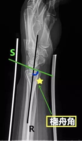 - 桡舟角:在腕关节侧位片桡骨与舟骨(掌侧与背侧)中轴线的夹角。