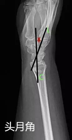 - 头月角:腕部侧位片上头状骨和月骨中轴线的夹角。