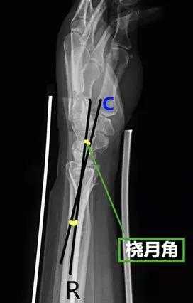 - 桡月角:在腕部侧位片上桡骨和月骨(近端与远端)中轴线的夹角。