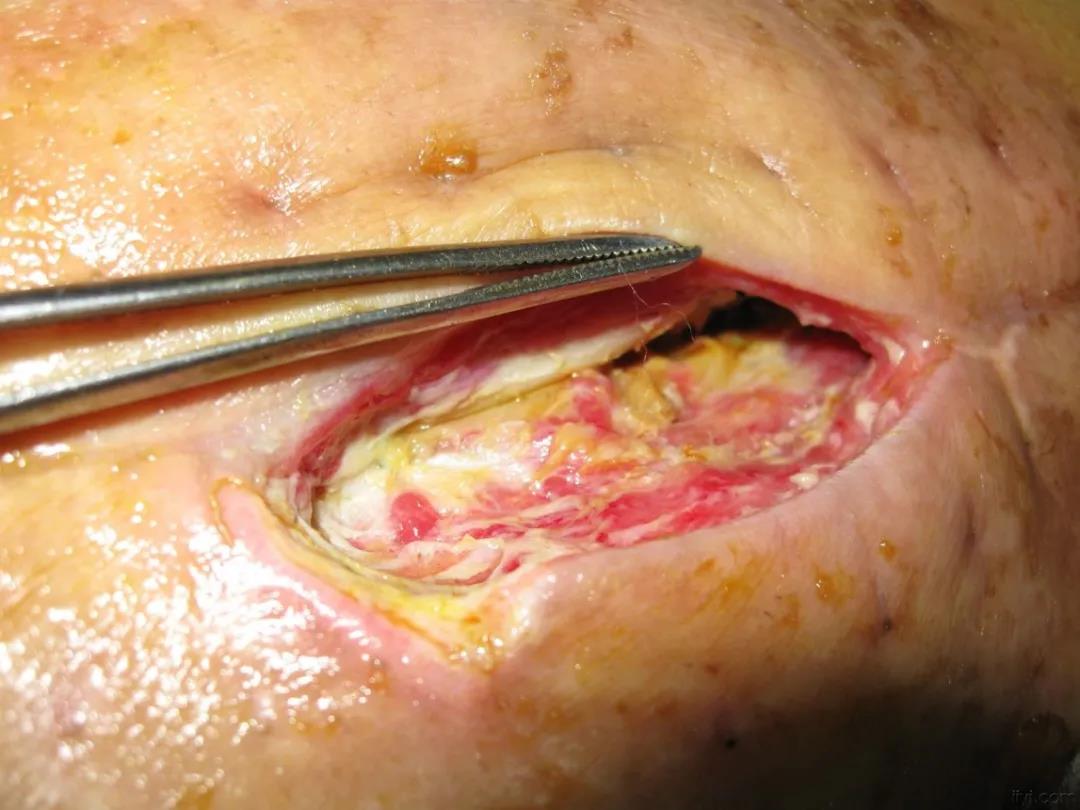 - ② 渗液较多,切口不愈合,应充分敞开切口,以生理盐水纱布湿敷引流,待见新鲜肉芽组织后行Ⅱ期缝合