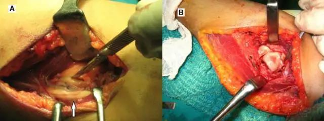 3、从肱肌、肱桡肌间隙进入,注意保护前臂外侧皮神经;酌情对桡动脉返支进行结扎、切断(图1);在肱肌、肱桡肌间隙深层,需要辨认出桡神经并加以保护(图2 A)。