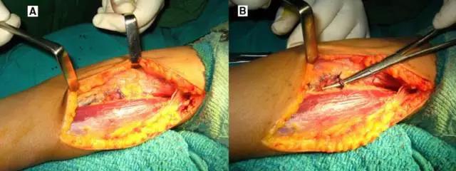 图1 A 切开浅层组织后显示肱肌、肱桡肌间隙以及桡动脉返支;B 若桡动脉返支(血管钳上方)阻挡手术入路,则需结扎并切断