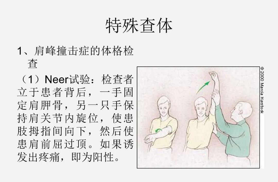 肩袖损伤多见于40岁以上男性,主要临床表现为肩关节疼痛和活动受限。疼痛多位于肩前方,三角肌前方及外侧,多在活动或增加负荷后加重;压痛多见于肱骨大结节近侧,或肩峰下间隙部位。主动活动受限以外展、外旋及上举受限较明显;被动活动受限不明显。肩袖损伤的诊断应综合考虑患者主诉、体格检查和影像学检查等。一、查体1、视诊和触诊:视诊主要观察三角肌、肩胛肌、方肩等。触诊需要检查肩锁关节、肱骨大结节、结节间沟的压痛,看是否合并其他病变。2、活动度:活动度检查包括主动活动度和被动活动度检查,两侧对比。肩关节活动度包括前屈上举、体侧外旋、体侧内旋、外展90°外旋及内旋等。通过Apley Test(摸背实验)可以粗略的观察肩关节内旋、外旋活动度。