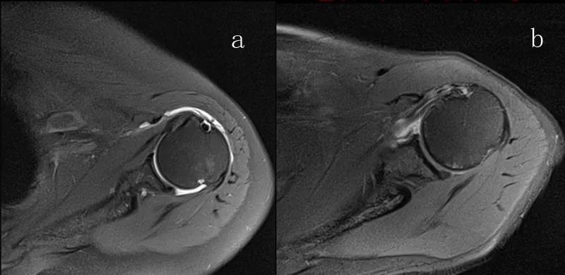 图23 横断位a.正常肩胛下肌;b.肩胛下肌损伤