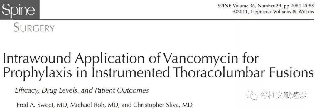 结论:体外模型中,万古霉素诱导硬膜细胞死亡,抑制生长,并以浓度依赖的方式改变细胞形态。确定一个安全的万古霉素浓度是必要的,既可以杀菌,又不抑制正常的硬膜愈合。文献6:胸腰椎融合术中切口内预防应用万古霉素粉末:安全性、血药浓度和患者反应(切口局部使用万古霉素粉对血药浓度影响很小)