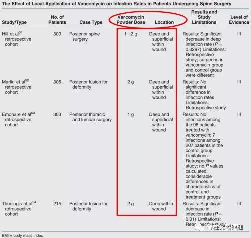 结论:(见下表)目前多数文献报道的万古霉素粉末在脊柱切口局部使用方法及剂量存在很大差异(0.5g~6g),通常使用剂量1~2g,最常为1g。使用范围包括:筋膜表面、筋膜下肌肉/骨等深部组织。