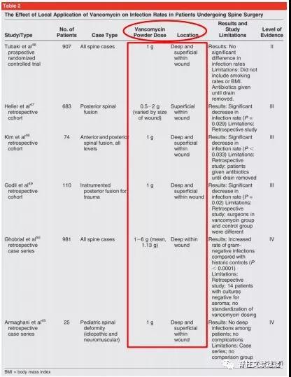 背景:大家比较关注的局部使用万古霉素粉末潜在风险,包括革兰氏阴性菌和多重耐药菌的产生,局部组织刺激增加,或过敏反应,肾功能受损,血清肿形成增加。然而,目前还没有证据表明,局部使用万古霉素会使上述风险增加。此外,美国食品及药物管理局(FDA)仍还没有推荐使用的标准剂量及切口内使用范围。