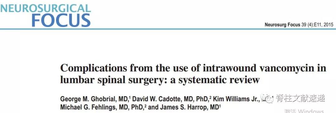 1. GhobrialGM, Cadotte DW, Williams K Jr, Fehlings MG, Harrop JS: Complications from theuse of intrawound vancomycin in lumbar spinal surgery: a systematic review.Neurosurg Focus 39(4):E11, 2015.[PMID:26424335;https://www.ncbi.nlm.nih.gov/pubmed/26424335]2. Eder C, Schenk S, Trifinopoulos J, Külekci B, Kienzl M, SchildböckS, et al: Does intrawound application of vancomycin influence bone healing inspinal surgery? Eur Spine J 25:1021–1028, 2016.[PMID:25904413;https://www.ncbi.nlm.nih.gov/pubmed/25904413 ]3. Goldschmidt E, Rasmussen J, Chabot JD, Gandhoke G, Luzzi E,Merlotti L, et al: The effect of vancomycin powder on human dural fibroblastculture and its implications for dural repair during spine surgery. J NeurosurgSpine 25:665–670, 2016.[PMID:27258478;https://www.ncbi.nlm.nih.gov/pubmed/27258478 ]