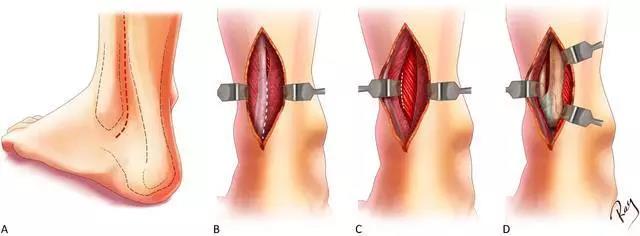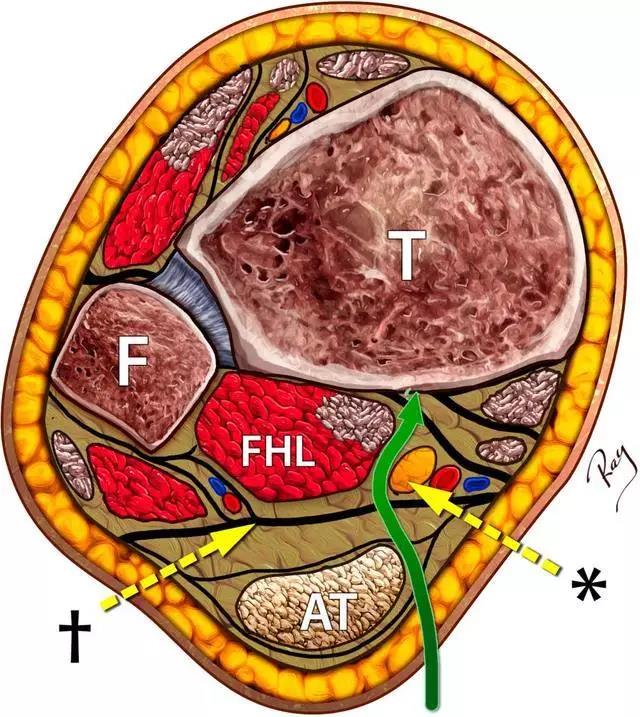 该入路可显露整个后方,无需过度牵拉软组织,入路界面在跟腱与拇长屈肌间(如图 12)。