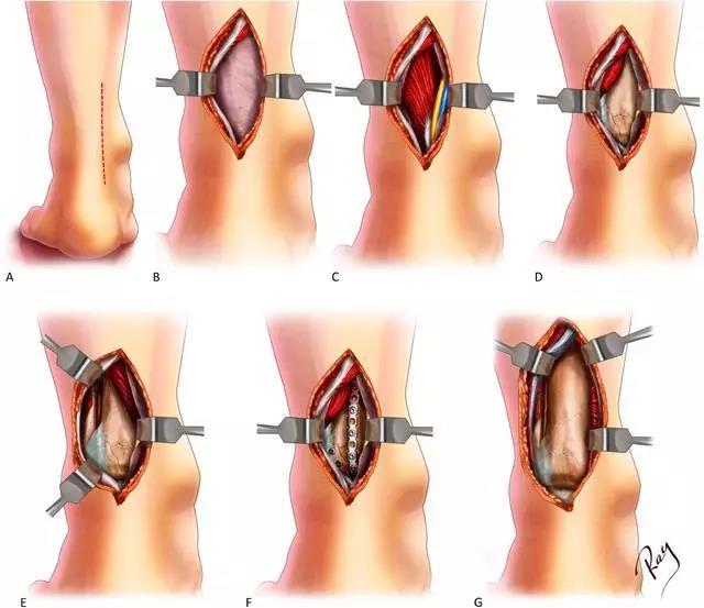 若需要固定后内侧,必须选择后内侧入路。该入路若显露后内侧时困难,需要过度牵拉软组织。入路最近端可将肌肉剥离骨间膜。后方固定可用抗滑钢板或拉力螺钉,腓骨肌牵向内侧也可固定腓骨。