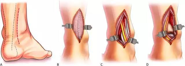 入路切口位于踝关节处跟腱与胫骨远端内侧缘之间(如图 10A),近端平行胫骨内侧缘,远端平行胫后肌腱。显露深层结构(如图 10B),胫后、趾长屈、拇长屈肌腱及胫后神经血管束(如图 10C);打开深层间隙入路依赖于骨折块位置,一般有三种间隙显露骨折块:胫后与胫骨内侧缘间、胫后与趾长屈间、趾长屈与拇长屈间,注意保护神经血管束,可牵向后外侧(如图 10D)或前内侧,后内可上支撑板固定。后内侧显露视野有限,后方骨折累及外侧者显露不佳,同时此入路不可固定腓骨。