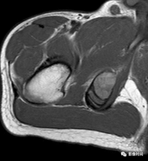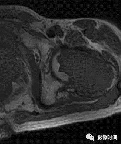 X 线平片及 CT 不能明确肿瘤的纤维基质成分,但其内如果有散在骨化可表现为磨玻璃样改变如骨纤维结构不良(图 26)。在 MRI 上, 富含胶原纤维的肿瘤如韧带样纤维瘤在 T1Wl 和 T2WI 上其信号强度一般较低(图 27)。