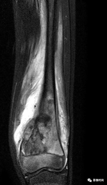 肿瘤周边的骨髓水肿表现为 T1WT 低信号和 T2WI、STIR 高信号边界模糊的片状影,软组织肿块邻近的正常软组织成分,尤其是肌肉内亦可出现水肿,表现为肿块周围沿肌束方向分布的边界模糊的片状或羽毛状影,有时可连成片。瘤周水肿常见于恶性肿瘤(图 58),但也可见于某些良性肿瘤如软骨母细胞瘤(图 59)、骨样骨瘤和骨嗜酸性肉芽肿(图 60)等。