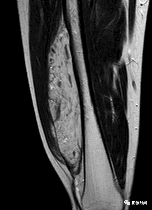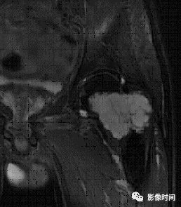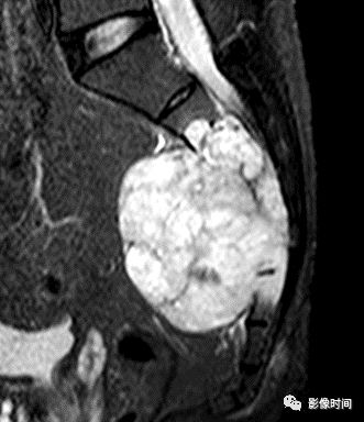 (四)黏液样基质:肿瘤内含有大量的黏液基质,在 MRI 上有一定特征性,T1WI 等低信号,T2WI 呈高信号,增强扫描随着时间的延长可呈渐进性的云絮状强化。