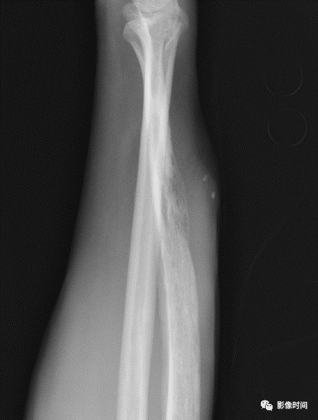 图 44 层状骨膜反应:骨嗜酸性肉芽肿
