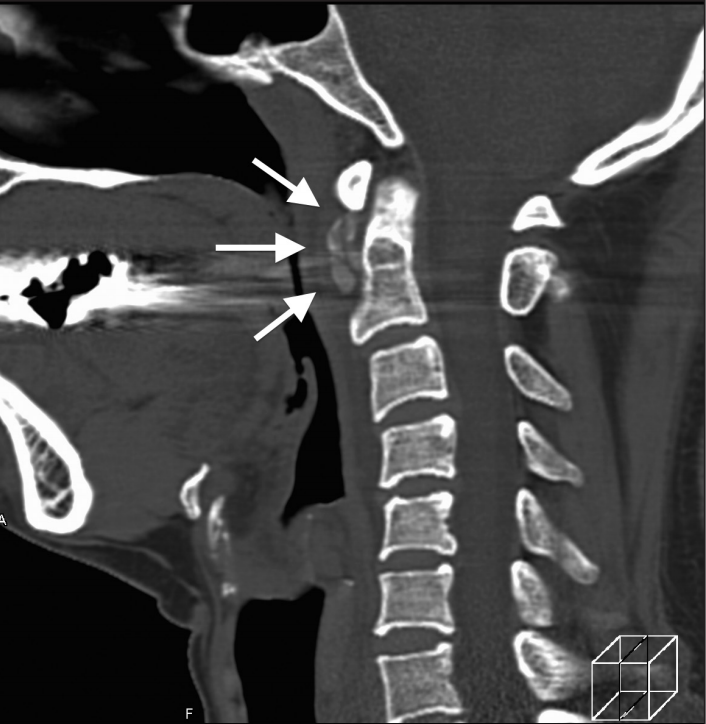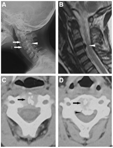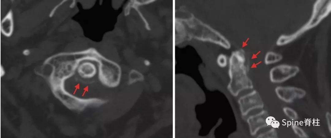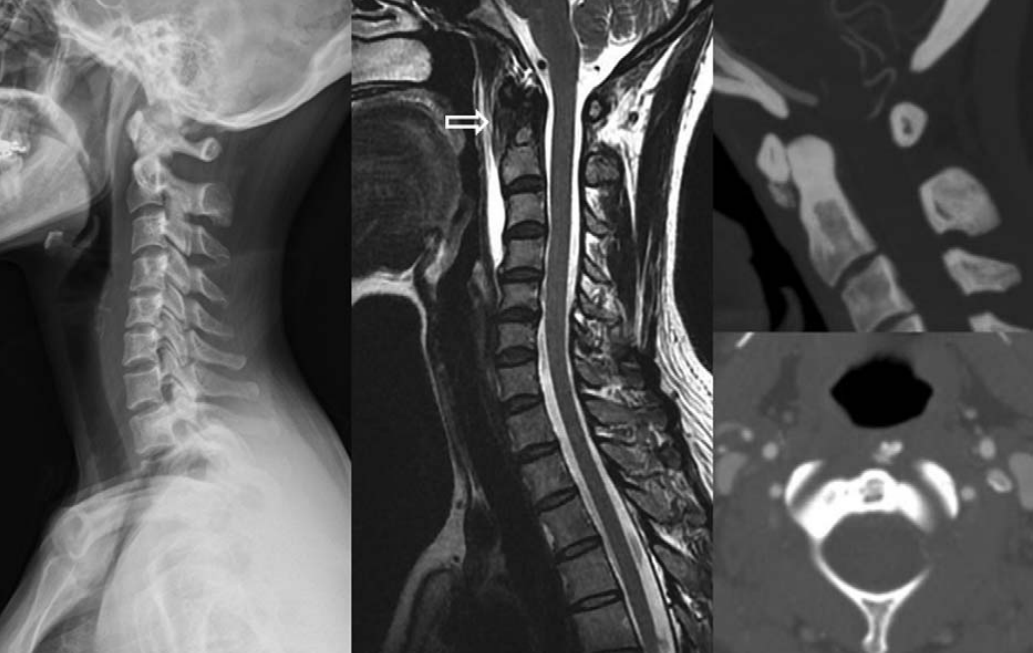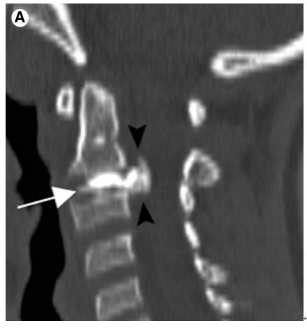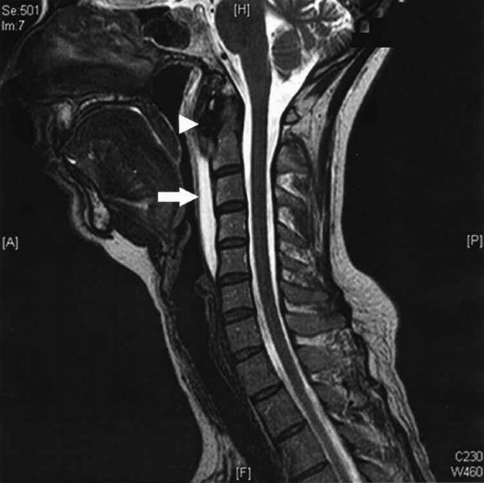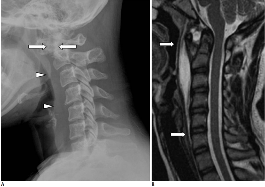 C1-2前侧低信号(无线箭头)和C1-5椎前水肿(长箭头) (PMID: 19567634)