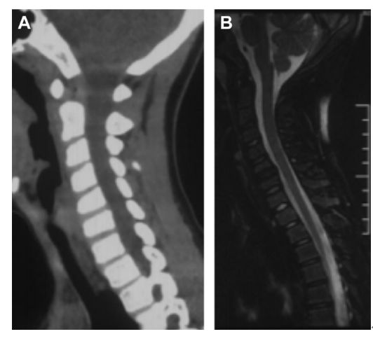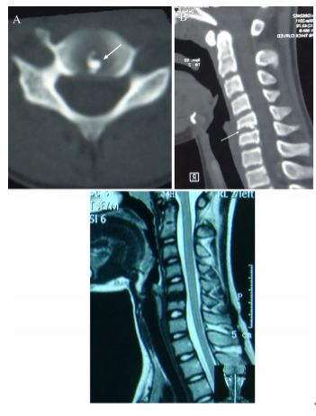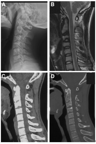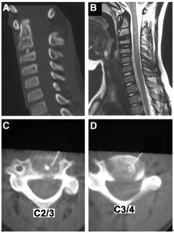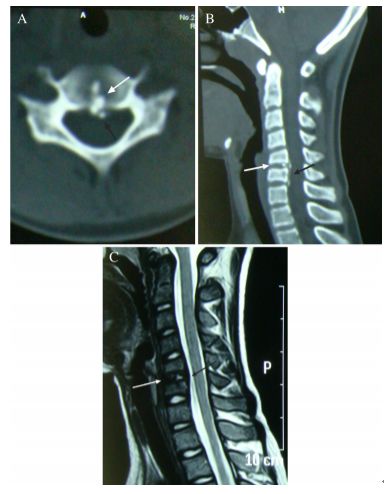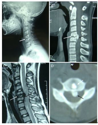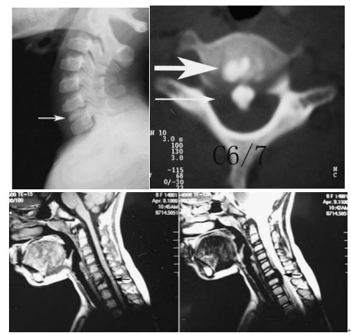 图:8岁女孩,因颈腰痛伴左上肢放射痛2月余就诊,颈椎侧位片、CT和MRI表现与上述病例类似。
