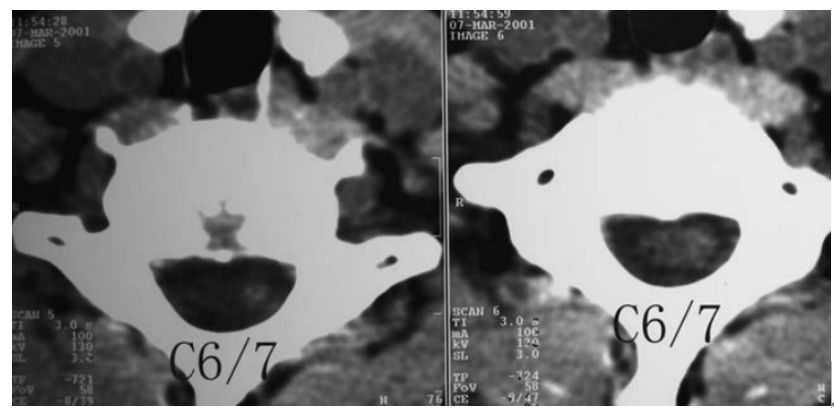 图:2年后复查CT示C6-7钙化的椎间盘和后纵韧带骨化都消失了