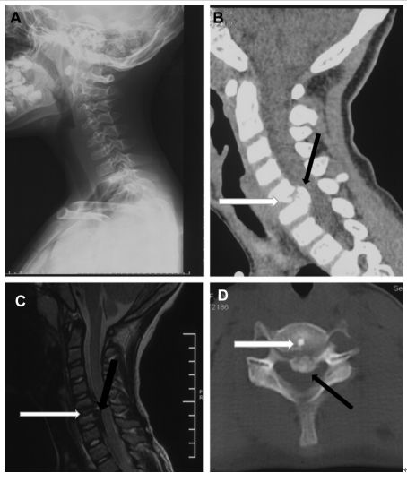 30岁女性,诊断为颈长肌钙化性肌腱炎,但钙化位于不寻常的位置:C4-5椎间隙前侧。A:颈椎侧位片示寰枢椎半脱位(长箭头)和椎前软组织肿胀(无线箭头);B,C和D:颈椎MRI示C1-6椎前软组织肿胀伴积液,D示齿状突骨侵蚀(无线箭头)