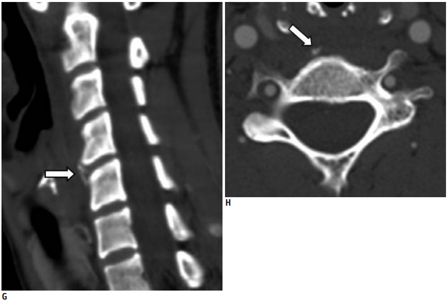 上述病人,E为增强,F为抑制像,G和H:经非甾体抗炎药治疗3天后查颈椎CT示C4-5椎前无定形钙化。