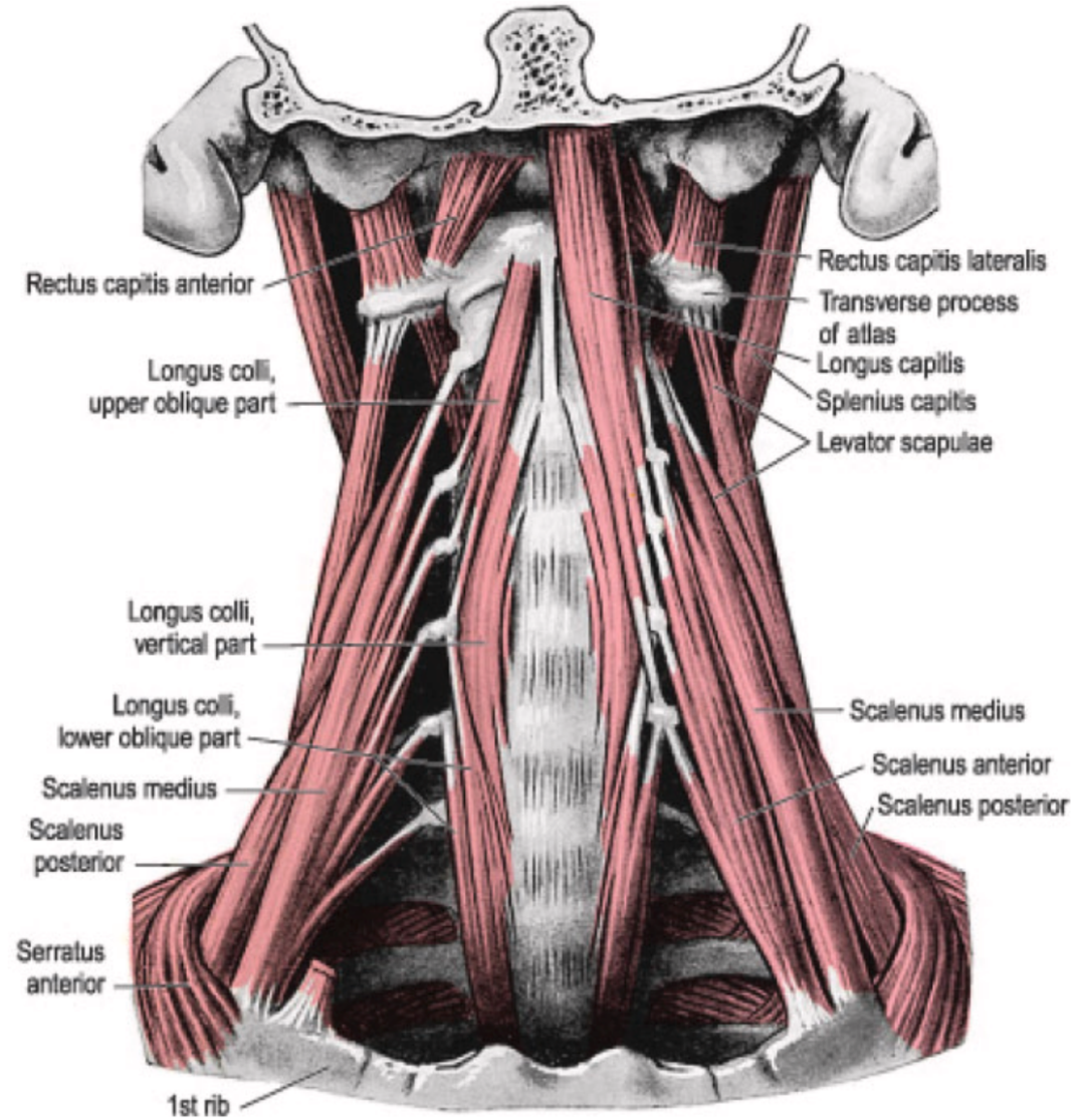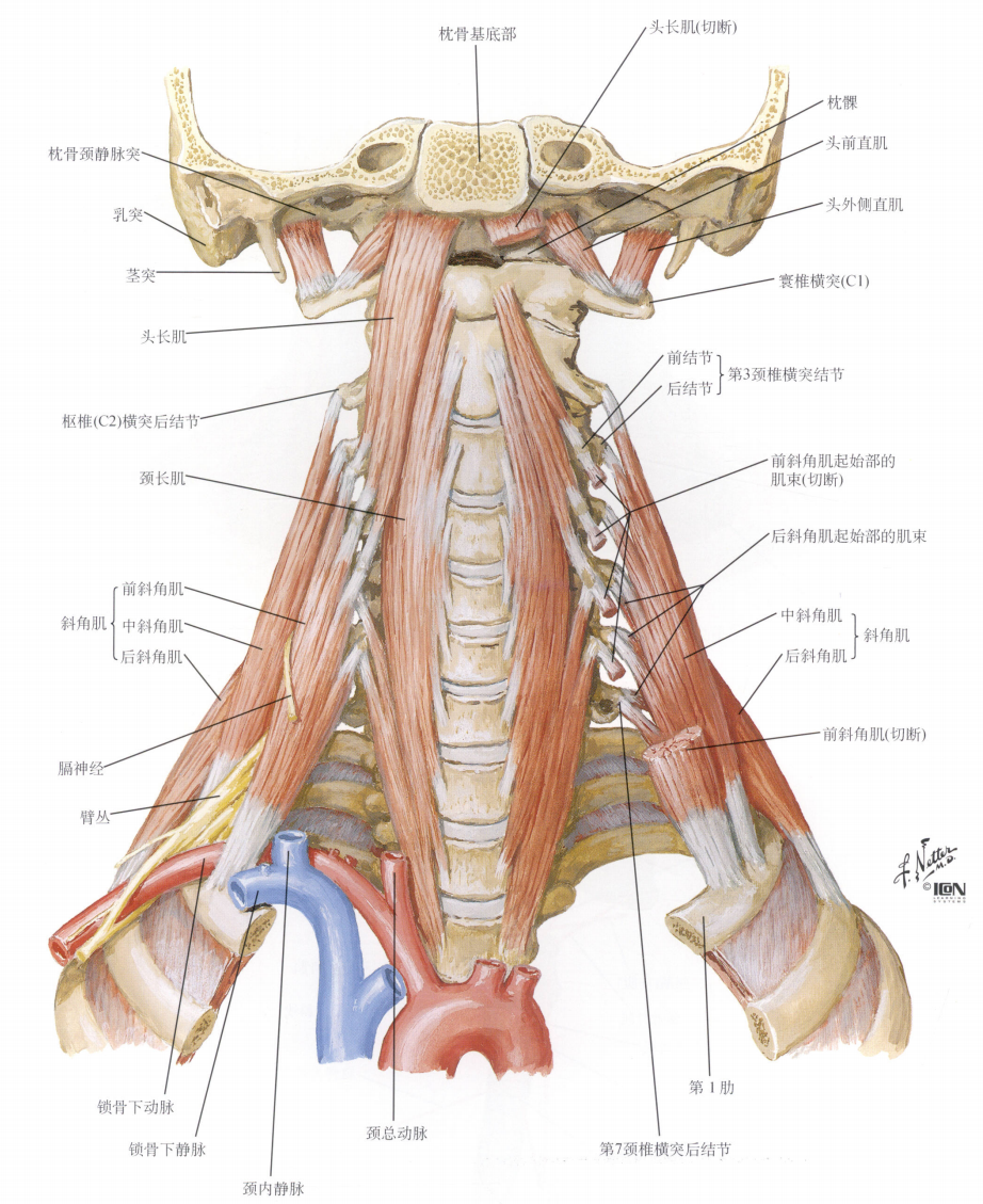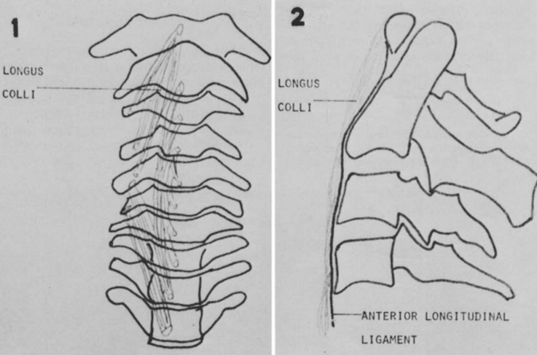 颈长肌是位于C1-T3椎体前缘的成对肌肉,由上斜肌、直肌和下斜肌组成,在上内侧附着于寰椎的前结节。从侧面看,颈长肌与前纵韧带均位于颈椎椎体前方,形成厚度3-4mm的软组织层。钙化常发生于上斜肌。