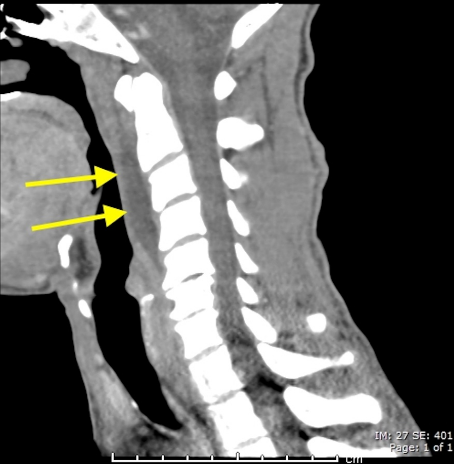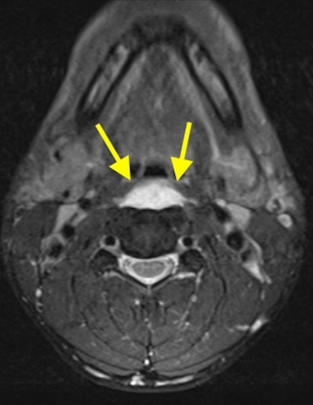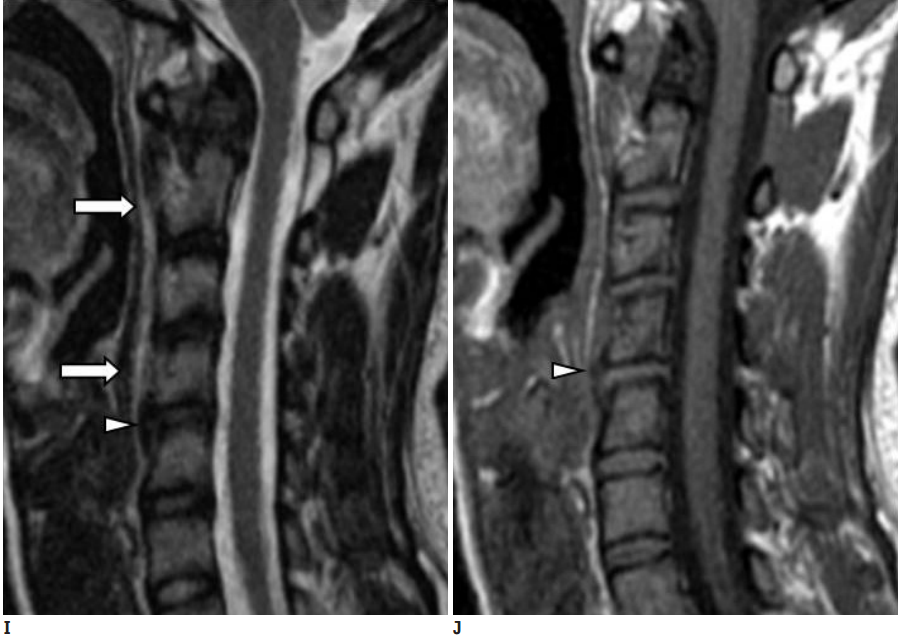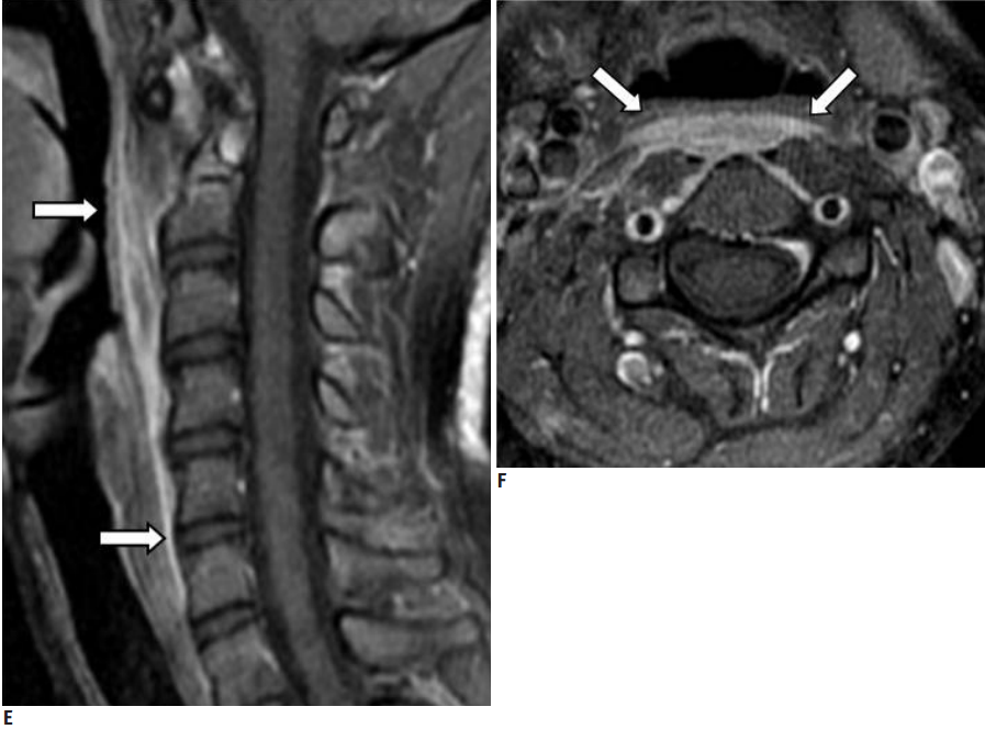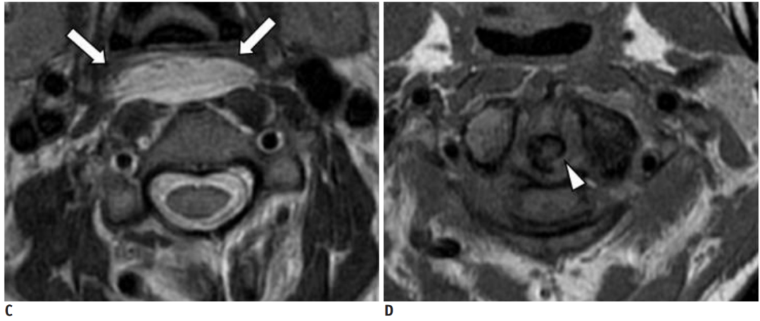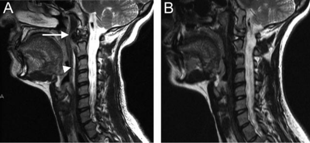 36岁女性,急性颈痛、吞咽困难伴颈部僵硬,MRI示C1-2前部颈长肌增厚呈低信号,提示钙化(长箭头)和C1-4椎前积液(无线箭头),经类固醇和止痛药治疗8天后症状消失,复查MRI提示上述表现消失。(PMID: 18765656)