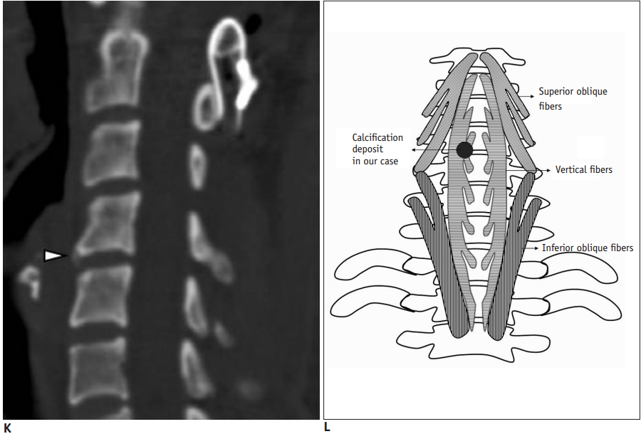 上述病人,I和J: 入院4天后复查颈椎MRI示椎前积液明显减少; K,随访2个月复查CT示C4-5前钙化灶减小。(PMID: 21852912)