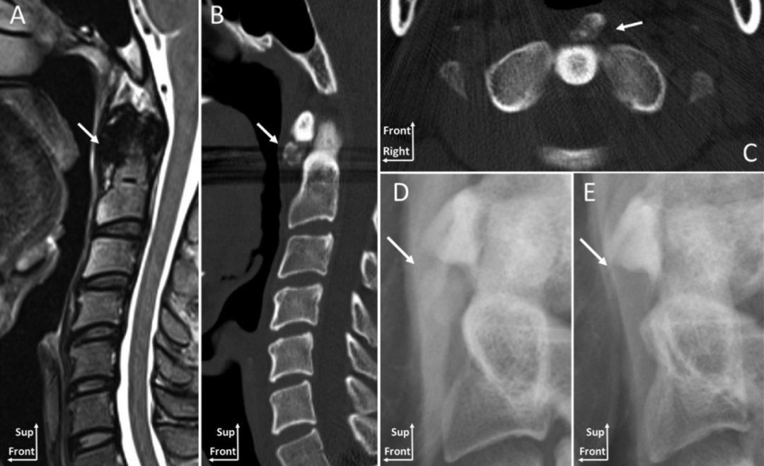 一位84岁的男性患者,因“急性颈痛、僵硬伴发热”就诊。查体:颈椎向各个方向活动受限,无明显神经病变体征。实验室检查:血沉及C反应蛋白偏高。颈椎CT平扫提示齿状突横韧带钙化(箭头所示),从而诊断为齿状突加冠综合征。给予洛索洛芬治疗一周后,上述症状完全缓解,而且炎性指标恢复正常。