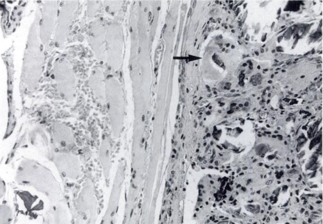 图:光镜可见典型的钙质肉芽肿病变,多核巨噬细胞吞噬钙质结晶(箭头)