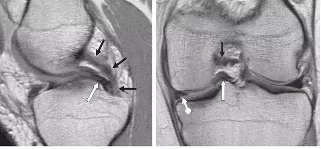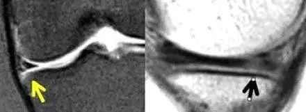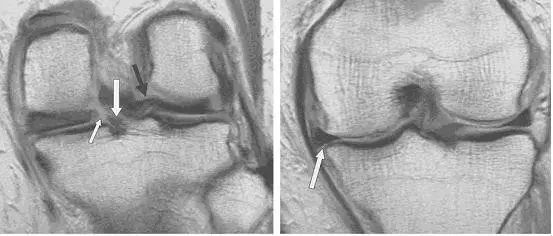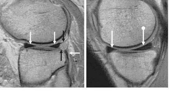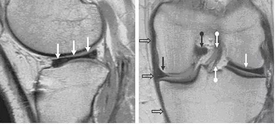 左图:冠状面可见内侧半月板后角在与根部(与胫骨连接的部位,白色大箭头)交接的部位有一个全层的撕裂(白色小箭头),可与对侧正常结构对比(黑色箭头)。右图:冠状面可见内侧半月板体部膨出关节(白色箭头),半跨与胫骨平台上。本图还可看到内侧股骨髁的关节软骨有相较于外侧的退行性缺失。