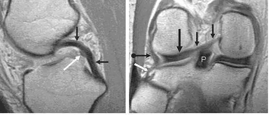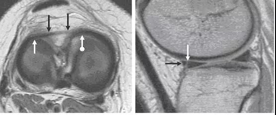 左图:横断面 T1 像显示半月板横韧带连接内侧半月板(白色圆箭头)和外侧半月板(白色直箭头)的前角;右图:经过半月板横韧带(黑色箭头)的矢状面,可见半月板横韧带与半月板前角之间的间隙呈现高信号(白色箭头),易误诊为半月板撕裂。