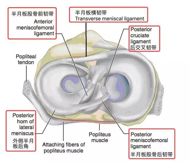 前后半月板股骨韧带(Humphry 和 Wrisberg 韧带 )分别位于后交叉韧带的前后。连接外侧半月板后角和股骨内侧髁外面。