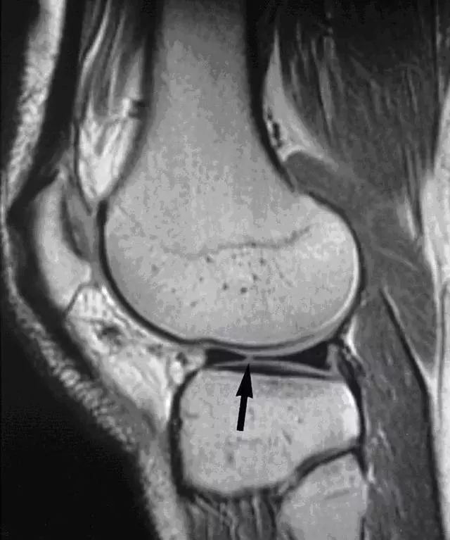 图 9 矢状面图像上可看到黑色箭头所指处,有一线性增强信号横贯内侧半月板后角,提示半月板斜行撕裂。