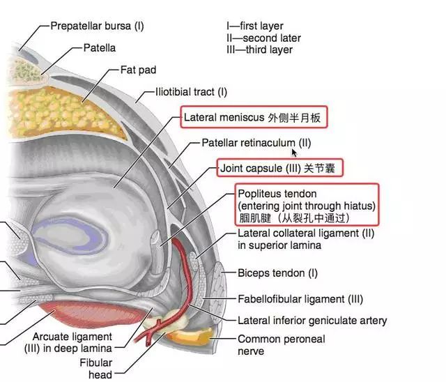 图 1 可看到外侧半月板后角由腘肌半月板纤维束形成裂孔,其中通过腘肌腱。
