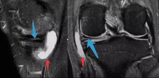 T2像中可看到明亮的囊肿(红色箭头)和水平走形的线形高信号(蓝色箭头)。半月板囊肿是由于半月板撕裂后组织液聚集在关节腔形成。是否有半月板囊肿对手术入路的选择有重要影响。